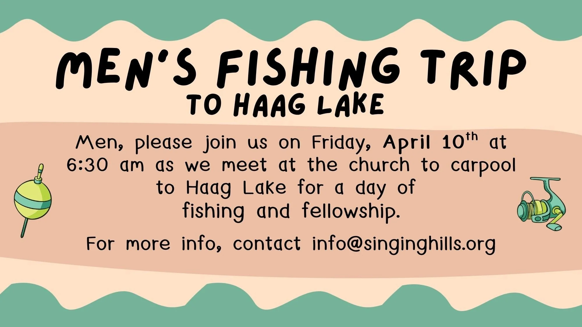 Men, we will meet at the SHCC parking lot on Friday morning, April 10th, at 6:30 am to carpool to the lake. A fishing license is required for the day if you plan to fish. If you are not interested in fishing, you can come and just hang out with us. Bring a snack, lunch, and a drink. We will return by 2:00 pm. If you have any questions, please email us at info@singinghills.org.