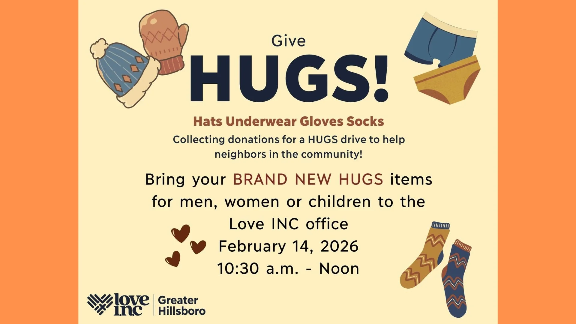 It is time for the Annual Love Inc. Hats, Underwear, Gloves, and Socks Collection drive! There will be a basket in the foyer each Sunday until the end of February. Also, there will be a collection at the Hillsboro Love Inc office on Wednesday, February 14th, from 10:30 am – noon.